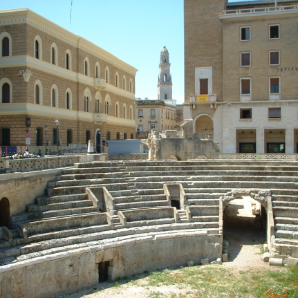 Lecce passou de cidade grega a cidade romana. Começaremos a nossa caminhada pela Plaza Sant'Oronzo, que abriga uma das mais importantes ruínas romanas: 25.000 assentos de anfiteatro, do século I a.C. e uma coluna que estava originalmente em Brindisi para marcar o fim do Caminho da Appia.