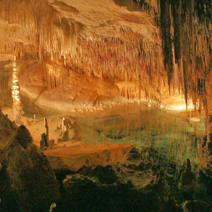 As cavernas escondidas dentro de um grande lago subterrâneo, Lago Martel, considerado um dos maiores lagos subterrâneos do mundo (177 m. Long por 30 m. Wide), onde são oferecidos concertos diários de peças de música clássica Caballero , Chopin, Offenbach ... a beleza única destas cavernas é realçada pela luz planejada e executada pelo engenheiro Carlos Buigas.