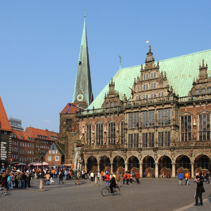 A magnífica prefeitura, o Rathaus de estilo renascentista alemão e a estátua majestosa de Roland na famosa praça do mercado, a Marktplatz, são um Patrimônio Mundial pela UNESCO e orgulho dos seus habitantes. Na mesma praça um pouco fora de sintonia, está o edifício do Parlamento, que data de 1960, é a Haus der Bürgerschaft , em frente a este edifício está o " esgoto de Bremen" , onde você pode jogar uma moeda que mais tarde destina-se a caridade, e ouvir os músicos de Bremen.